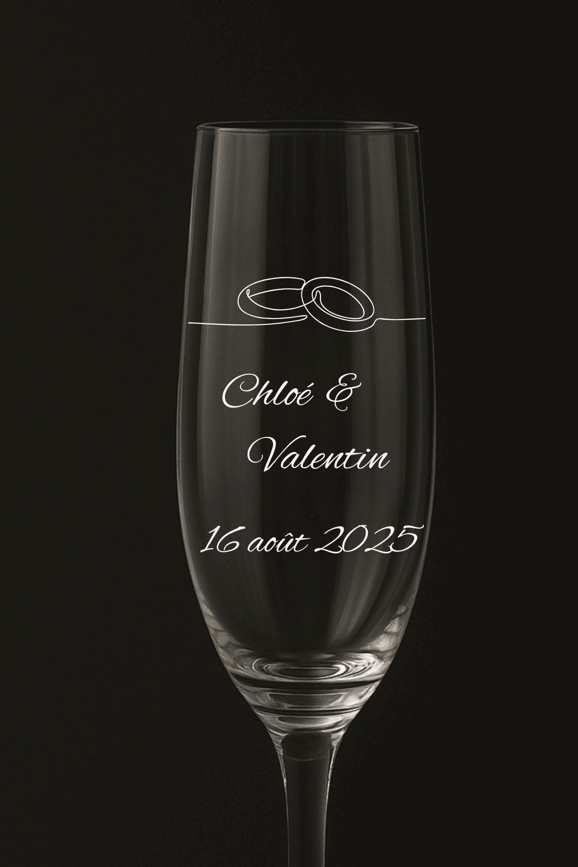 Cette flûte à champagne personnalisée modèle Alliances met en avant un symbole incontournable du mariage : deux anneaux entrelacés représentant l’union, l’amour et l’engagement. Ce motif délicat est gravé au laser accompagné de vos prénoms et de la date de votre événement, pour créer un souvenir raffiné, unique et chargé d’émotion.